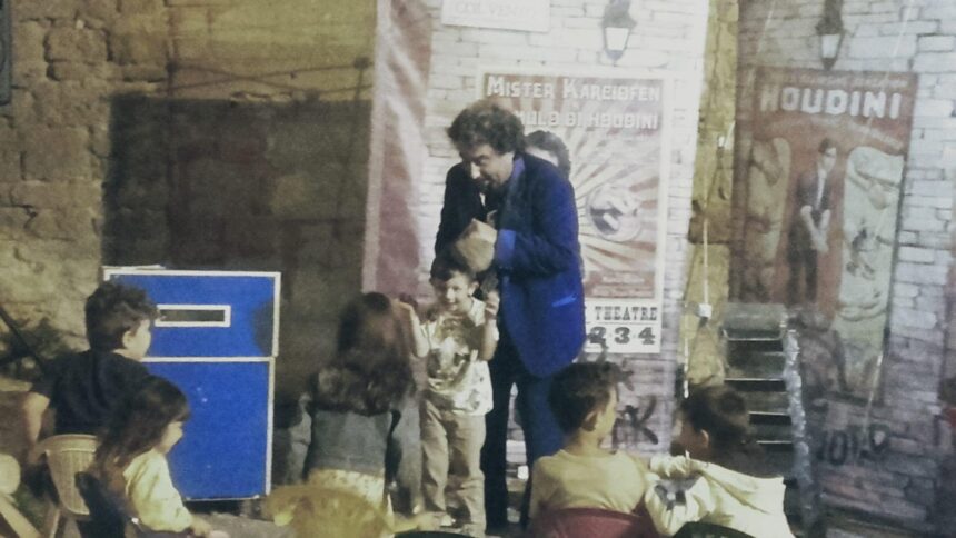 Alle 20,30 nella piazzetta antistante la chiesa San Giuseppe, Mr Karciofen in “Magic cabaret” si esibirà in uno spettacolo di cabaret magico e numeri da fantasista per ragazzi e famiglie. Michele Celeste, in arte Mr Karciofen, propone un repertorio che diverte tutti, coinvolgendo gli spettatori sul palcoscenico. Allievo tra gli altri del fantasista Jack La Cayenne (quello della tazzina in bocca), da oltre vent'anni porta sulle scene di tutta Italia gag e numeri di magia comica. Ha avuto partecipazioni televisive nella seconda stagione di Cultura Moderna di Teo Mammucari e in alcune puntate de I Cesaroni 3. Ha realizzato le strisce pubblicitarie della prima serie di Italia's got talent ed è stato più volte ospite di Salvo La Rosa nel programma televisivo Insieme. Di recente ha impersonato Michele, impiegato dell'ufficio anagrafe collega del ragionier Cusumano (Carmelo Galati) nella prima e seconda serie della fiction La mafia uccide solo d'estate, trasmessa da Rai Uno.