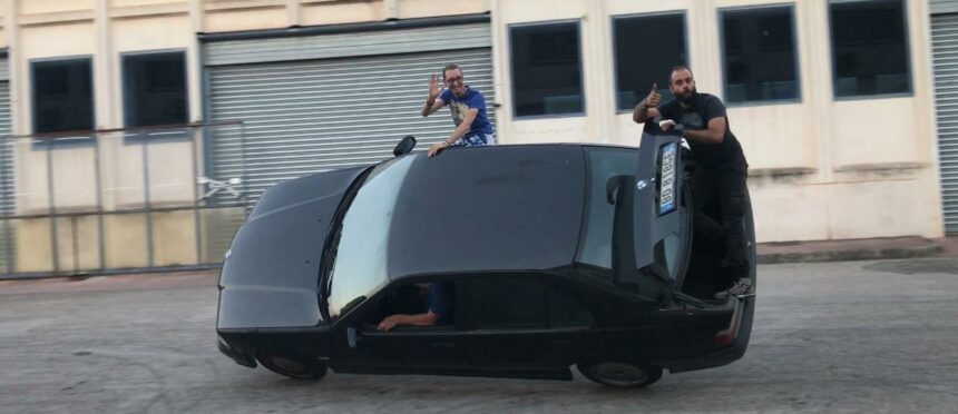 Due auto e una rampa autocostruita, ciò che basta per dar vita a manovre mozzafiato e al limite dell’equilibrio.