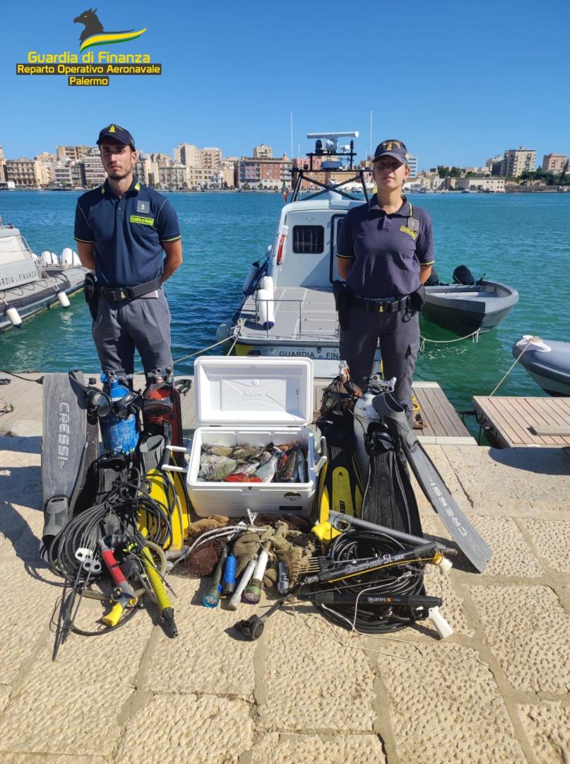 I finanzieri della Sezione Operativa Navale della Guardia di Finanza di Trapani, nell’ambito dei servizi di polizia economico-finanziaria coordinati dal Reparto Operativo Aeronavale di Palermo e mirati al contrasto della pesca di frodo, hanno sorpreso un natante da diporto intento in attività illecita nelle acque antistanti l’isola di Favignana. Il tempestivo intervento delle Fiamme Gialle ha consentito di cogliere in flagranza sei soggetti che, muniti di attrezzatura non consentita tra cui fucili, pinne, maschere, bombole e torce, detenevano oltre 25 kg di varie specie ittiche illegalmente catturate.