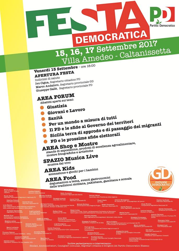 Torna in grande stile a Caltanissetta, il 15,16 e 17 Settembre la Festa Democratica, la tradizionale Kermesse organizzata dal Partito Democratico che quest’anno, nella cornice della Villa Amedeo, sarà particolarmente ricca di eventi e di nomi di spicco della politica, della cultura e della società nazionali e locali. Come nella migliore tradizione delle Feste dell’Unità si alterneranno i forum di confronto politico e di attualità (con nomi quali Andrea Orlando, Fabrizio Micari, Davide Faraone, Enzo Bianco, Giusy Nicolini e Michele Emiliano) a momenti culturali e ricreativi, con un area bimbi e uno spazio culinario dove degustare le eccellenze eno-gastronomiche della nostra terra. Ma andiamo con ordine: l’intera area della Villa comunale è stata all'occasione divisa in 4 aree tematiche: un’area forum; un’area kids; un’area food e un’area shop.