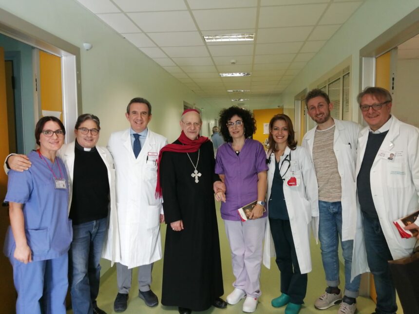 Il vescovo Mario Russotto, accompagnato da padre Giuseppe Anfuso e dal presidente dell'ordine dei medici Giovanni D'Ippolito, in occasione delle festività natalizie ha visitato i malati ricoverati nei vari reparti dell’ospedale Sant’Elia consegnando ad ognuno di loro una cartolina di auguri. “Ho visitato gli ammalati uno per uno in tutti i reparti – ha detto il vescovo Russotto – così è come se fosse arrivata un po’ la carezza di Dio. Ogni ammalato è come un Gesù Bambino, si affida alle cure, alle premure di chi gli sta intorno, dei medici, della istituzione sanitari. Non potevo non dire loro buon Natale e siate fiduciosi perché per me è fondamentale riscoprire insieme la solidarietà divenendo tutti sentinelle di prossimità”. Il vescovo quest’anno ha celebrato due messe, una per gli infermieri al Monastero delle Clarisse, e una per i medici nella cappella del Seminario. “E stato un momento di intimità e di riflessione altissimo – ha detto il vescovo – ai medici e agli infermieri ho detto che prendersi cura significa avere premura per l’ammalato. Perché la felicità di un medico o di un infermiere dipende dalla felicità che sono in grado di generare nel cuore dell’altro. Magari, in base alla malattia, non potranno dare la terapia definitiva che li guarisca ma potranno guarire il loro cuore se questi pazienti si sentono accolti e ascoltati, cioè al centro dell’attenzione”.