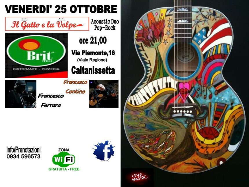 Da una canzone di successo di Edoardo Bennato a un duo catanese: venerdì 25 ottobre alle ore 21.00 il Gatto e la Volpe allieteranno la serata del Brit Italia di via Piemonte 6, angolo viale della Regione, a Caltanissetta.