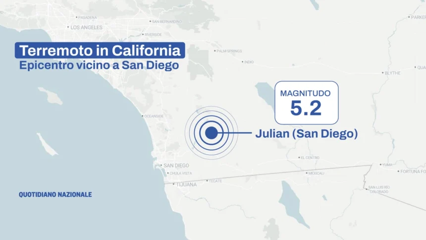 (Adnkronos) – Un forte terremoto ha colpito oggi il sud della California. L'epicentro del sisma di magnitudo 5.2, secondo l'istituto americano Usgs, è stato registrato a circa quattro chilometri a sud di Julian, a poco più di un'ora di auto da San Diego. La zona si trova poco lontano dal confine con il Messico. La scossa è stata registrata a una profondità di otto chilometri, secondo i dati dell'Usgs. La scossa iniziale è stata seguita da altre di minore intensità. Al momento non ci sono notizie di danni. —internazionale/esteriwebinfo@adnkronos.com (Web Info)