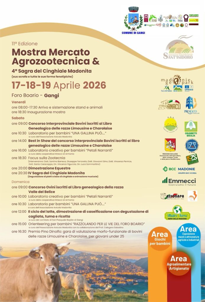Dal 17 al 19 aprile 2026 torna uno degli appuntamenti più attesi del panorama rurale madonita: la Mostra Mercato Agrozootecnica, giunta alla sua 11ª edizione, e la 4ª Sagra del Cinghiale Madonita, iniziative promosse dall'Associazione Sant'Isidoro in collaborazione con il Comune di Gangi.