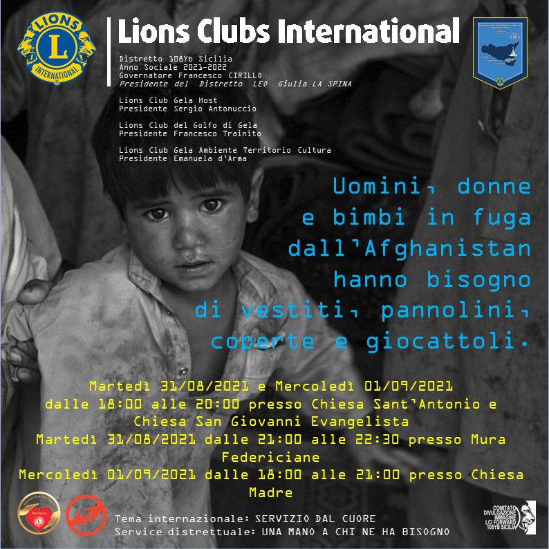 La sezione di Gela del Lions Club International ha promosso una raccolta di indumenti, scarpe, coperte, pannolini e giocattoli per i profughi afghani in transito dalla base militare di Sigonella. Questi i punti di raccolta istituiti a Gela: oggi, martedì 31 agosto e domani 1° settembre dalle 18 alle 20 nelle Chiese di Sant' Antonio e San Giovanni Evangelista: sempre oggi 31 agosto dalle 21 alle 22,30 alle Mura Federiciane (Cortile scuola Santa Maria di Gesù) e domani, mercoledì 1° settembre dalle 18 alle 21 in chiesa Madre.