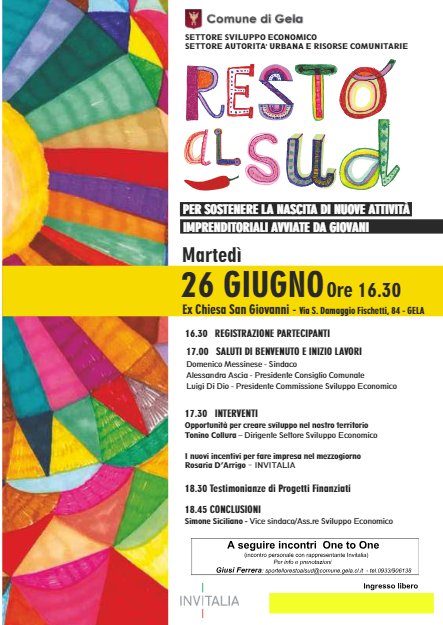 Domani, martedì 26 giugno, si terrà a Gela, alle 16.30 all’ex Chiesa San Giovanni in via S. Damaggio Fischetti n°84, un incontro con Invitalia, organizzato dal Comune di Gela – Settore Sviluppo Economico, per presentare il bando “Resto al Sud” per sostenere la nascita di nuove attività imprenditoriali avviate da giovani tra i 18 e 35 anni.