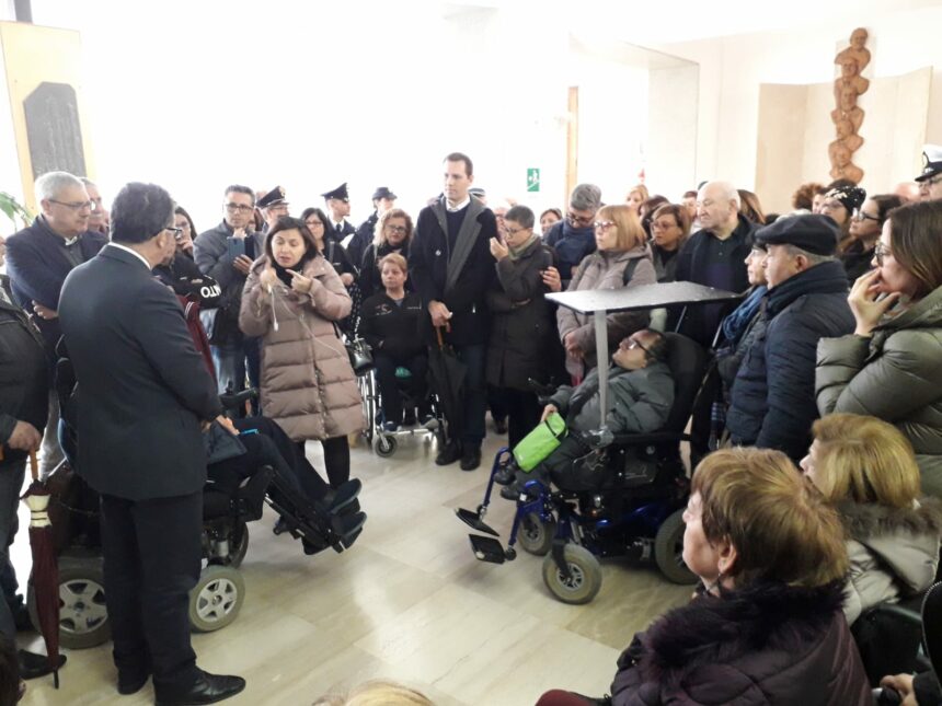 Dopo una manifestazione svoltasi in Piazza Enrico Mattei, ad una delle fermate dei pullman, dove hanno contestato il mancato abbattimento di barriere architettoniche (scale e marciapiedi) persino nel palazzo di città, si sono recati in municipio per essere ricevuti dal commissario straordinario, Rosario Arena.