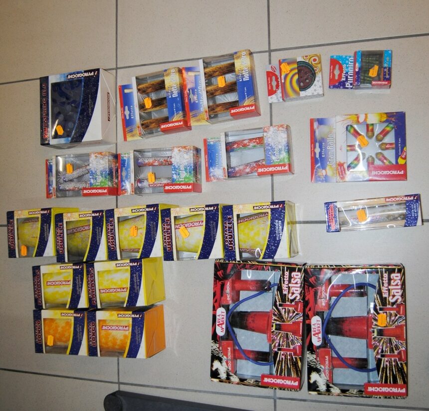 confezioni di artifizi pirotecnici privi del marchio CE e delle avvertenze di pericolosità.