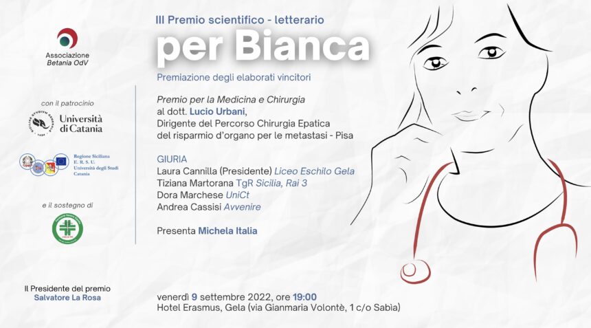 Tutto pronto per la cerimonia di consegna delle due borse di studio dedicate alla memoria della dott.ssa Bianca Cannizzaro, medico di Gela, specialista reumatologo, scomparsa prematuramente nel 2018. Gli assegni saranno consegnati nell’ambito della III edizione del premio letterario-scientifico “per Bianca”, nato per volontà della famiglia “La Rosa – Cannizzaro” e organizzato dall’associazione Betania OdV e Centro di Cultura e Spiritualità Cristiana “Salvatore Zuppardo”, con il patrocinio dell’Università degli Studi di Catania e dell’Ersu di Catania.