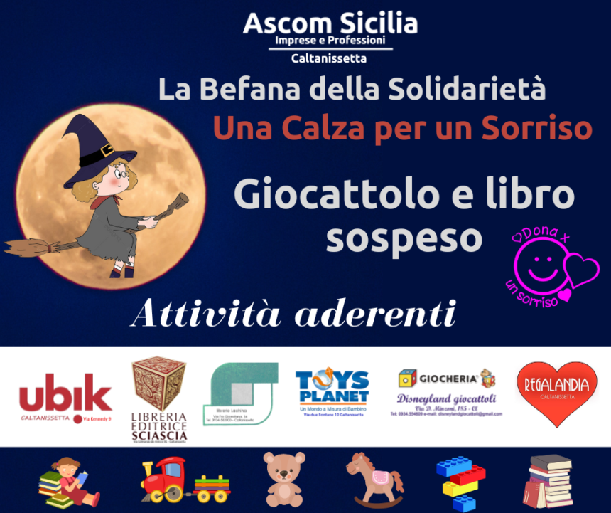 “Giocattoli e libri sospesi” Iniziativa di carattere solidale dell’Ascom Sicilia Caltanissetta in collaborazione con l’Associazione “Dona X un sorriso” per donare giocattoli e libri ai bambini meno fortunati. Il Natale è il periodo dell’anno in cui piccoli gesti di solidarietà possono dare tranquillità e serenità anche a chi sta vivendo un momento difficile ma anche permettere a chi regala un giocattolo di godere dello spirito natalizio. Chiunque desideri rendere felice un bambino potrà acquistare un giocattolo o un libro presso i negozi aderenti all’iniziativa e lasciarlo “sospeso”. I giocattoli e i libri raccolti verranno distribuiti, il giorno della Befana, ai bambini con la collaborazione dell’associazione “Dona X un sorriso”.