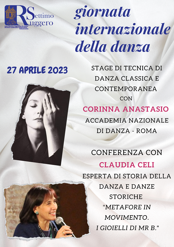 Giorno 27 aprile 2023 il Liceo Coreutico “R. Settimo” sarà lieto di ospitare la prof.ssa Corinna Anastasio, docente presso l’Accademia Nazionale di Danza di Roma, con un ricco curriculum alle spalle e numerose collaborazioni internazionali, che terrà per gli studenti uno stage di tecnica di danza classica e contemporanea. Durante la giornata i ragazzi avranno modo di incontrare in videoconferenza Claudia Celi, esperta di storia della danza e danze storiche, che terrà una conferenza dal titolo "Metafore in movimento. I gioielli di Mr B".