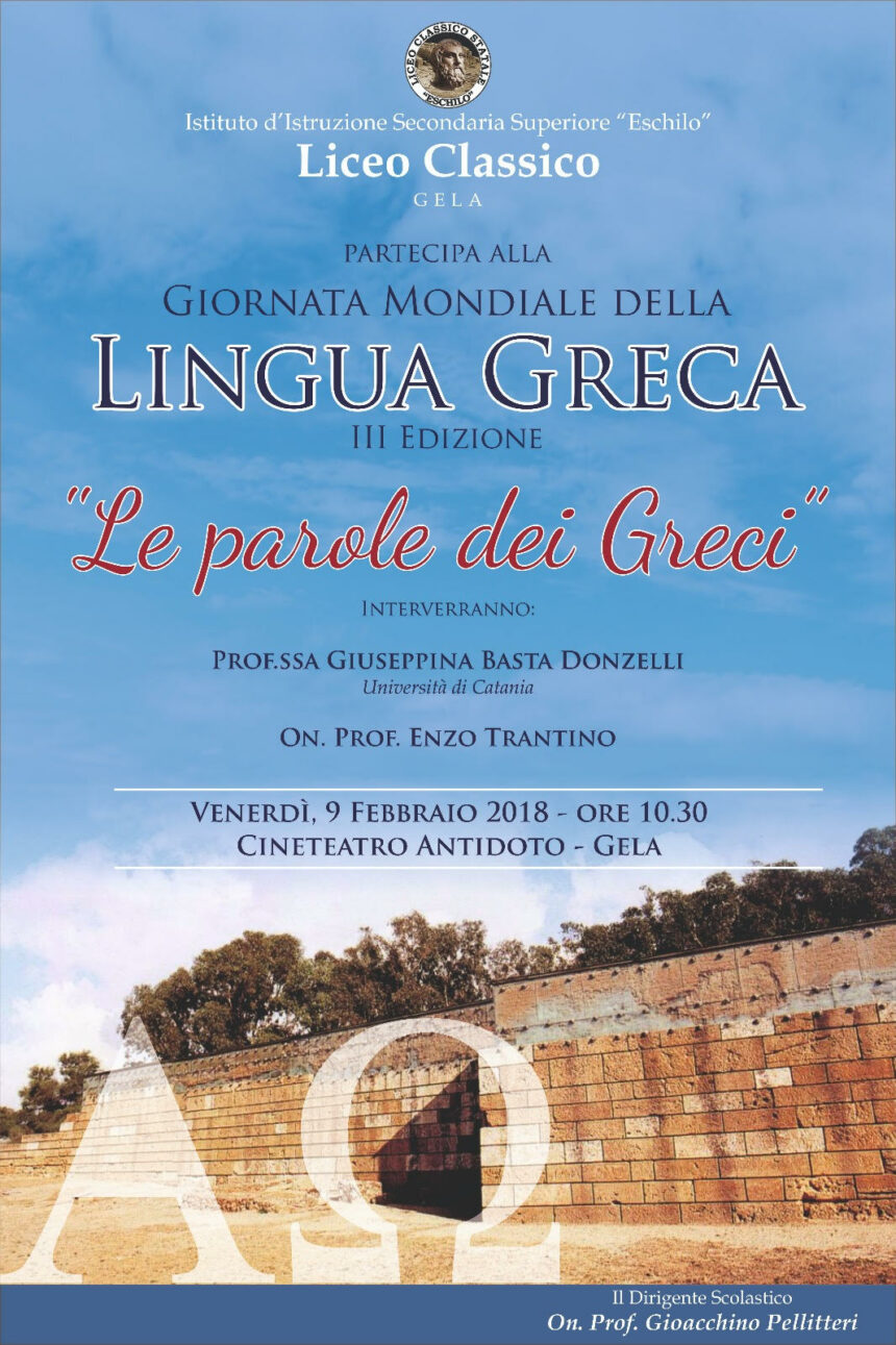 Il liceo classico Eschilo, dopo la Notte nazionale dei Licei classici, partecipa per la prima volta anche a questa iniziativa culturale di respiro internazionale. Il tema è "Le parole dei Greci" argomento di grande attualità che sarà sviluppato venerdì 9 febbraio alle 10,30 al cine teatro Antidoto di Macchitella dalla prof.ssa Giuseppina Basta Donzelli dell'Università di Catania che parlerà della nascita della civiltà occidentale attraverso la democrazia di Atene ed il teatro. L'on. Enzo Trantino con il suo intervento, invece, animerà la riflessione sul tema "E se non ci fossero stati i Greci?".
