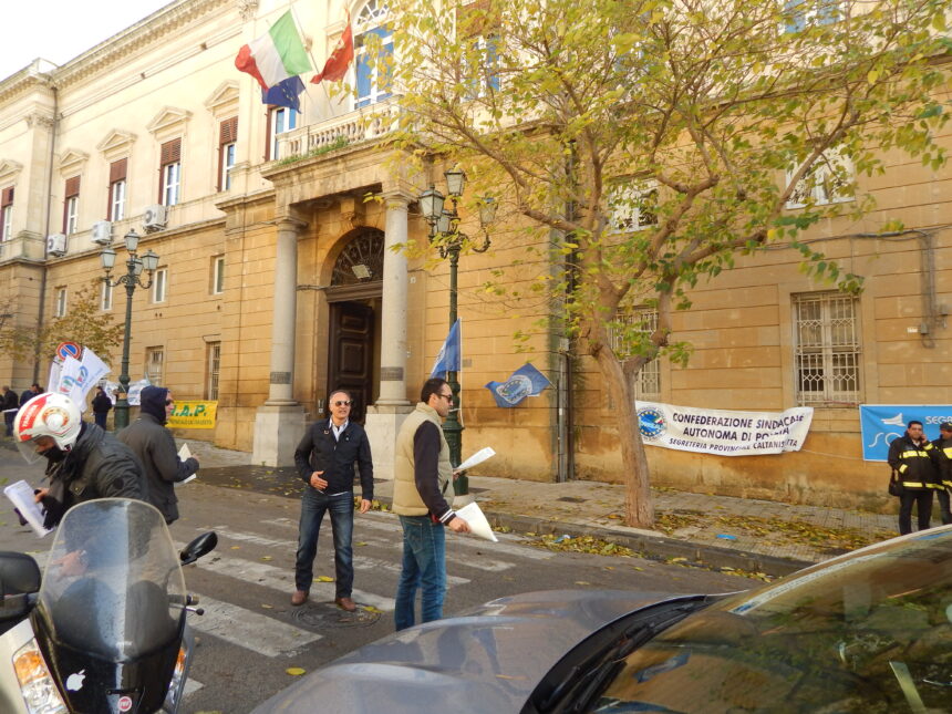 manifestazione sindacato siulp davanti la prefettura di caltanissettadipendenti che porta all’aumento di ore di lavoro settimanali per ciascun dipendente e, per di più, per  uno straordinario che non verrà pagato.