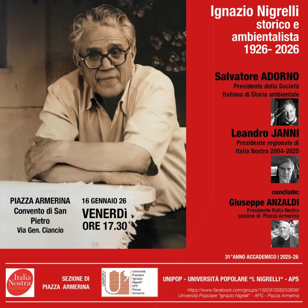Venerdì 16 gennaio 2026, l'Università Popolare “Ignazio Nigrelli” di Piazza Armerina, a 100 anni dalla nascita di Ignazio Nigrelli, ricorderà la figura dello storico e ambientalista siciliano al quale l'associazione è stata intitolata nel novembre 2000, pochi mesi dopo l'improvvisa scomparsa. Co-organizzatrice dell'incontro è la sezione di Italia Nostra di Piazza Armerina.
