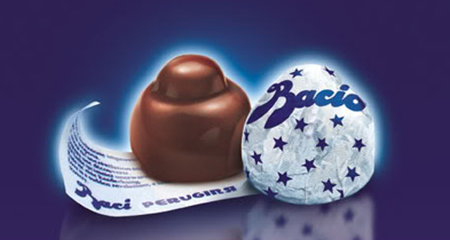 Il cioccolatino è squisito ma Giovanni Buitoni, suo socio e poi compagno di vita, è dubbioso: come può un cliente entrare in un negozio e chiedere alla commessa "Per favore, mi dà un cazzotto?". I due si accordano su un nome decisamente più dolce: "Bacio". Alla veste pensa l'Art director di Perugina e futurista, Federico Seneca, che sceglie l'ormai iconico involucro argentato (le stelline blu arriveranno poi), la confezione con i due amanti ispirati al dipinto di Hayez "Il bacio" e i famosi cartigli con le frasi d'amore. Ma non solo. Il primo bigliettino recita infatti: "Meglio un bacio oggi che una gallina domani".
