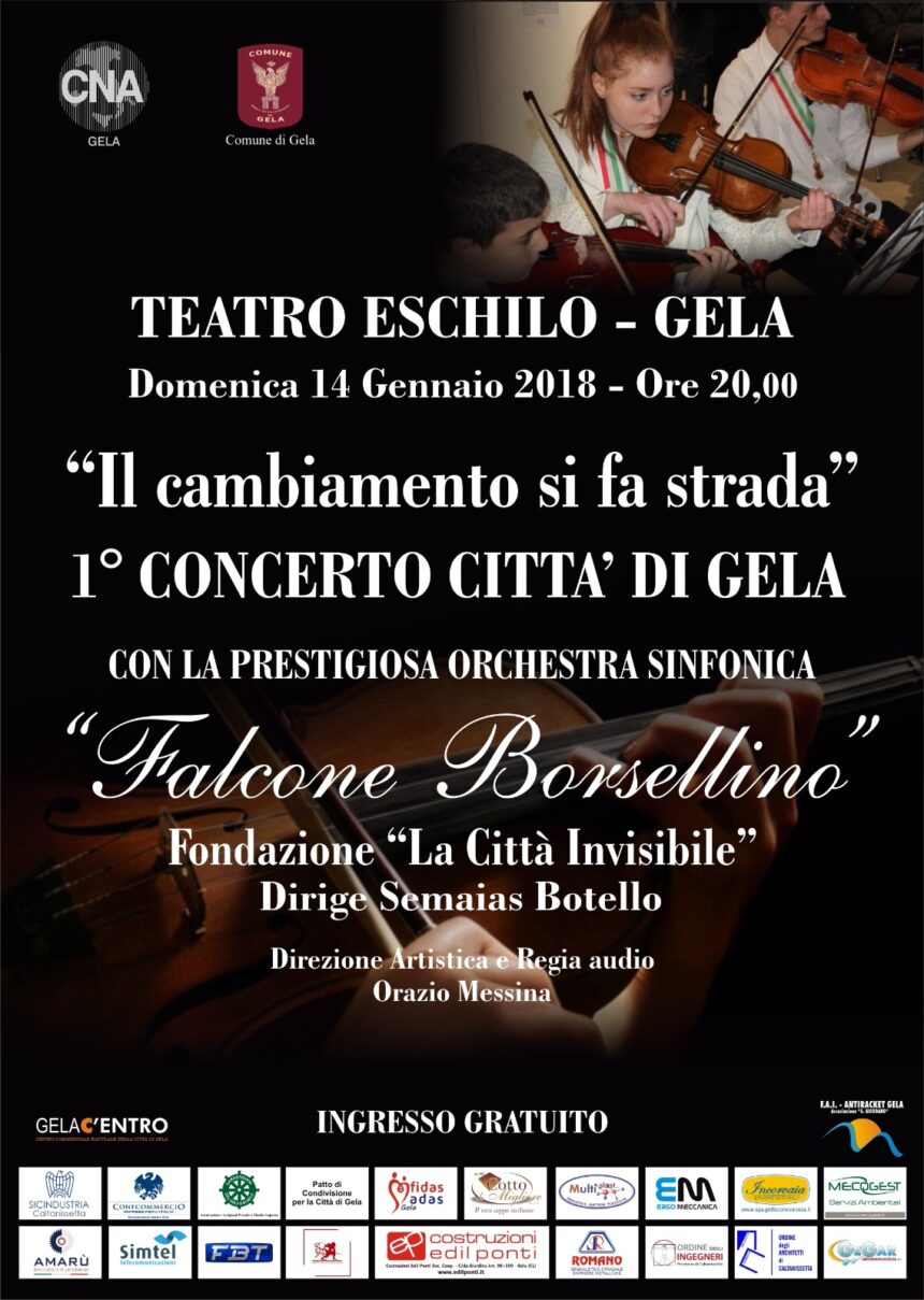 Appuntamento domenica 14 gennaio con il primo concerto Città di Gela " Il cambiamento si fa strada" organizzato dal CNA di Caltanissetta e Gela. Il concerto si terrà al teatro Eschilo alle 20 con ingresso gratuito.