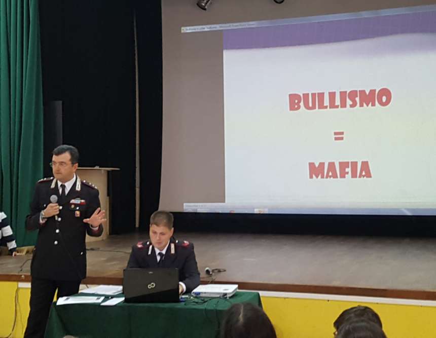 Partendo dall’equazione bullismo – mafia, per poi commentare i recenti gravissimi episodi verificatisi in alcuni istituti d’istruzione della Toscana e della Puglia e sfociati nella commissione anche di reati, sono state illustrate le diverse forme di prevaricazione più frequenti tra gli adolescenti quali le provocazioni e le prese in giro ripetute, le offese, gli scherzi, le percosse, i furti e il cyberbullismo. Il tenente colonnello Restuccia ha quindi chiarito e specificato i diversi ruoli dei protagonisti presenti nell’ambito dell’inquietante fenomeno del bullismo ossia il bullo, il sostenitore del bullo, l’aiutante del bullo, la vittima, il difensore della vittima e la maggioranza silenziosa, facendo un aderente parallelismo con quelli presenti nel fenomeno mafioso.