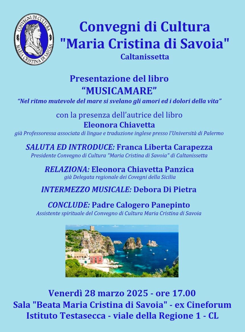 Il Convegno di Cultura “Maria Cristina di Savoia” di Caltanissetta organizza venerdì 28 marzo 2025, nella Sala “Beata Maria Cristina di Savoia” (ex. Cineforum) dell’Istituto Testasecca, viale della Regione 1 (1° piano), la presentazione del libro “MUSICAMARE – Nel ritmo mutevole del mare si svelano gli amori ed i dolori della vita”, alla presenza dell’autrice, Eleonora Chiavetta, già Docente associata di lingue e traduzione inglese presso l’Università di Palermo.