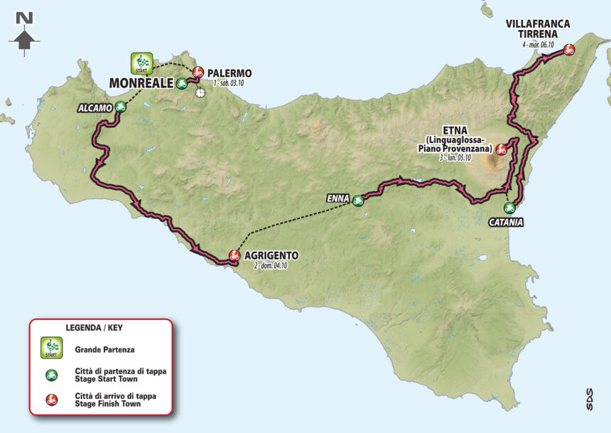 Martedì 6 ottobre ultima tappa sull’isola, con la quarta frazione da Catania a Villafranca Tirrena di 138 km, adatta ai velocisti.