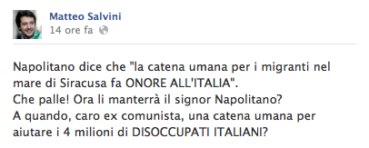 “Napolitano dice che “la catena umana per i migranti nel mare di Siracusa fa ONORE ALL’ITALIA”. Che palle! Ora li manterrà il signor Napolitano? A quando, caro ex comunista, una catena umana per aiutare i 4 milioni di DISOCCUPATI ITALIANI?”. E’ questo il contenuto letterale del post pubblicato su Facebook dal vice segretario della Lega Nord, Matteo Salvini.