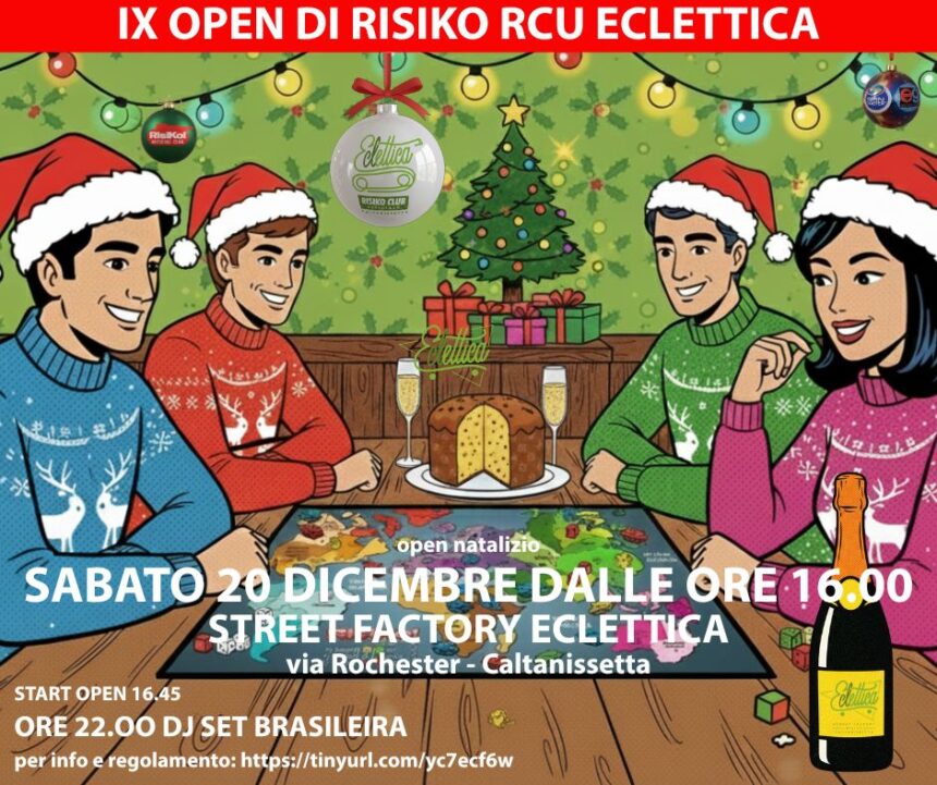 Dopo la conclusione del XXI° torneo vinto da Luigi Tricoli, il Risiko Club Ufficiale di Caltanissetta, organizza un Open (torneo aperto) valido per il Ranking interno e il Ranking nazionale 2025. “Vogliamo festeggiare e salutare tutti i soci e giocatori che in questo 2025 hanno giocato insieme a noi.- dichiarano dal direttivo- Alcuni per la prima volta altri frequentatori abituali dei nostri tavoli”.