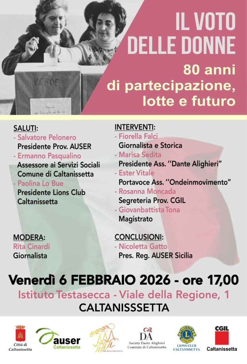 Venerdì 6 febbraio 2026, alle 17, all’Istituto Testasecca, si terrà l’incontro–dibattito “Il voto delle donne. 80 anni di partecipazione, lotte e futuro”, promosso da AUSER Caltanissetta insieme a realtà associative e istituzionali del territorio. Un appuntamento che non vuole limitarsi alla celebrazione della ricorrenza, ma interrogare il presente: cosa ha significato davvero il suffragio femminile? Quanto di quella promessa di uguaglianza è stata realizzata? E quali sfide restano aperte oggi, sul terreno della partecipazione e della rappresentanza? Ad aprire l’incontro saranno i saluti di Salvatore Pelonero, presidente provinciale AUSER, dell’assessore ai Servizi sociali del Comune di Caltanissetta Ermanno Pasqualino, e di Paolina Lo Bue, presidente del Lions Club Caltanissetta. Il cuore del dibattito sarà affidato a un parterre di interventi che incrociano storia, informazione, impegno civile e diritto. Interverranno la giornalista e storica Fiorella Falci, Marisa Sedita, presidente dell’Associazione “Dante Alighieri”, Ester Vitale, portavoce dell’associazione “Ondeinmovimento”, Rosanna Moncada, segreteria provinciale CGIL, e il magistrato Giovanbattista Tona. A moderare l’incontro sarà la giornalista Rita Cinardi, mentre le conclusioni saranno affidate a Nicoletta Gatto, presidente regionale AUSER Sicilia. In un tempo in cui la partecipazione politica appare spesso fragile e diseguale, l’iniziativa si propone come uno spazio di confronto aperto alla cittadinanza, per rileggere una conquista storica non come un traguardo acquisito una volta per tutte, ma come un processo ancora in divenire.