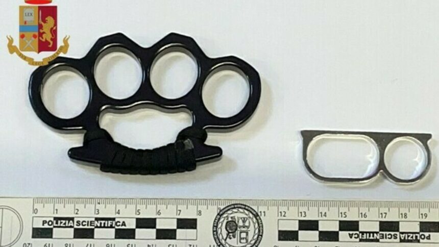 Nel corso della sera personale delle Volanti, in piazza Caduti del Mare, ha proceduto al controllo di un diciassettenne catanese che è stato trovato in possesso di un tirapugni metallico che portava in una borsa a tracolla, oltre a una piccola quantità di sostanza stupefacente del tipo marijuana, per un peso totale lordo di 0,44 grammi. Per quanto accertato, il giovane è stato denunciato in stato di libertà per porto abusivo di oggetti atti a offendere; inoltre, è stato anche stato segnalato per detenzione di sostanza stupefacente per uso personale.