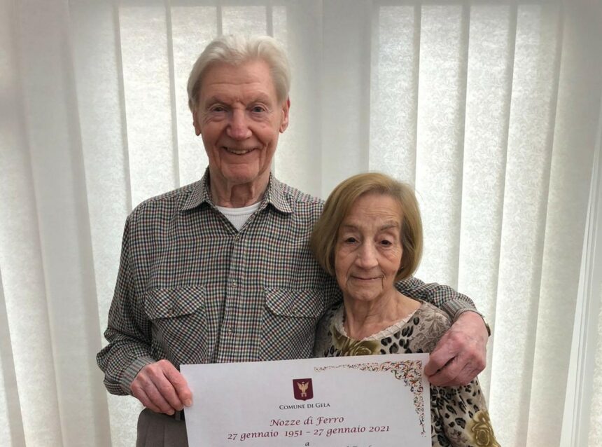Recita così la pergamena che il sindaco di Gela Lucio Greco ha fatto arrivare ai coniugi Clelland, in Inghilterra. La loro è una bella storia di famiglia, radici ed emigrazione iniziata lo scorso dicembre quando Diana Fulco ha scritto al Comune per richiedere un invio di auguri in occasione del settantesimo anniversario di matrimonio (nozze di ferro) dei propri nonni, celebrato il 27 Gennaio scorso. La signora Santina Ventura, figlia di Rocco Ventura e Giovanna Vicari, è originaria di Gela e si è trasferita in Libia per motivi di lavoro. Lì ha conosciuto il signor Clelland, originario dell'Inghilterra, dove abitano attualmente. “Come tutti gli emigrati, – si legge nella missiva – la signora Ventura ha sempre avuto Gela nel suo cuore e sarebbe un immenso onore ricevere un biglietto di auguri da parte del Comune di Gela per questo traguardo”.
