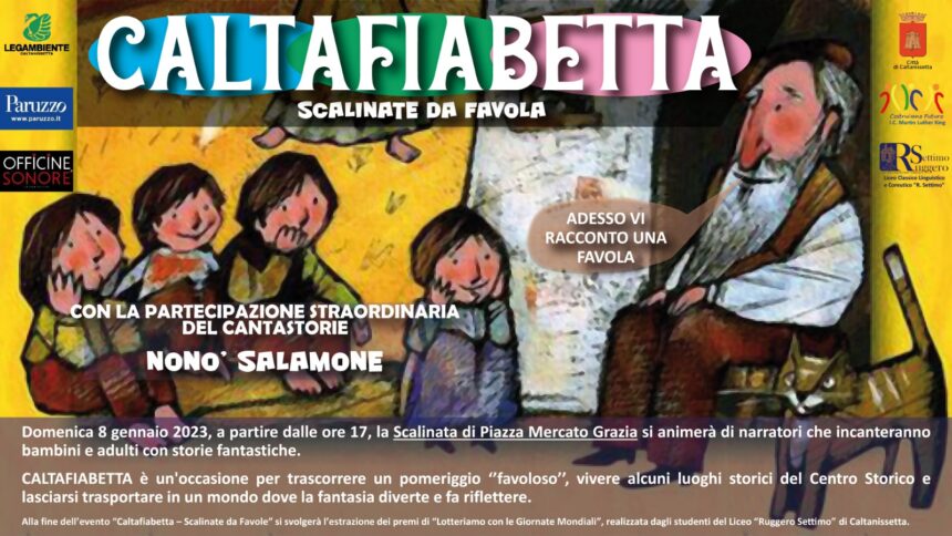 Si svolgerà domenica 8 gennaio 2023, a partire dalle ore 17, sulla scalinata di Piazza Mercato Grazia, l’iniziativa “CALTAFIABETTA – Scalinate da Favola”, promossa da Legambiente in collaborazione con l’Amministrazione Comunale di Caltanissetta, l’Istituto Comprensivo “Martin Luther King”, il Liceo Classico “R. Settimo”, la Tipografia Paruzzo e l’Associazione “Officine Sonore”. Per gli organizzatori vorrà essere l’anteprima di un evento più grande e strutturato, da realizzare possibilmente in un mese più caldo e con giornate più lunghe. Al momento l’iniziativa “Caltafiabetta” non prevede finanziamenti pubblici, è sostenuta con spirito volontaristico e non lucrativo e vuole essere in primis un regalo fatto ai bambini e alle bambine della Città, per la chiusura delle festività natalizie a cavallo del 2022-2023.