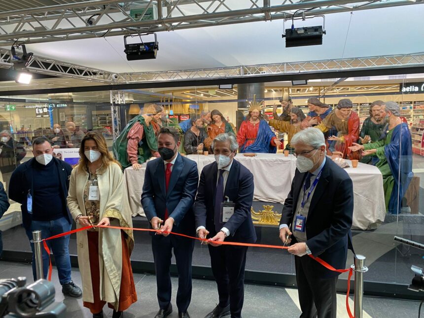 “L’ultima cena”, tradizionalmente conservata nella sala espositiva delle Vare di Caltanissetta, è esposta all’aeroporto capitolino grazie all’allestimento della Imprinting di Roma.
