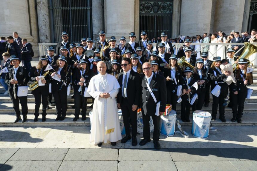 “La mattina del 12 novembre è stata veramente intensa – scrive Valerio Palumbo – iniziata alle 5:30 dall’albergo di Frascati, Colazione veloce e partenza per San Pietro. Arrivati a San Pietro qualche minuto e abbiamo fatto subito ingresso nella corsia prenotati per andarci a sistemare subito a ridosso del sagrato Della basilica di San Pietro. Già essere posizionati lì ci ha veramente riempito di emozione. Dietro di noi una piazza gremita di fedeli provenienti da tutto il mondo: Nuova Zelanda, Messico, Venezuela, Brasile, Giappone, Cina Dopo Qualche minuto ecco passare la Papa mobile di fronte a noi .. fuori le bandierine ad acclamare il santo padre Iniziamo subito a suonare con il boato dei fedeli che ci acclama. Poi il momento più atteso.. finita l’udienza veniamo chiamati dal cerimoniere a posizionarci dietro l’altare . L’emozione a mille, molti ragazzi della banda con le lacrime agli occhi consapevoli del fatto che quello che stava per accadere era qualcosa di irripetibile; arriva il Santo padre , io e il fondatore Maurizio ad accoglierlo con tanta commozione, la foto di gruppo e la benedizione a tutti noi. I ragazzi grati allo staff della San Pio X che in questi mesi ha organizzato alla perfezione. Questo stupendo viaggio intitolato “in cammino verso il Santo Padre “