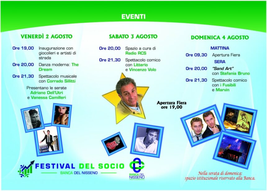 Tre giorni per far conoscere le realtà imprenditoriali del Nisseno. Sarà una grande vetrina commerciale la Fiera dell'economia locale, manifestazione che rientra tra gli eventi previsti nell'ambito del Primo Festival Socio organizzato dalla Banca del Nisseno – Credito Cooperativo che inizia oggi 2 agosto – a partire dalle ore 19 – proseguirà sabato 3 e si chiuderà domenica 4 lungo il corso Cavalieri di Vittorio Veneto, a Serradifalco. L'evento è realizzato col patrocinio del Comune di serradifalco e la collaborazione della Pro Loco. “Sono queste le date nelle quali abbiamo dato appuntamento per ritrovarci numerosi e condividere l'esperienza dell'anno sociale con la consegna delle borse di studio, la valutazione delle iniziative del 2013 e la presentazione delle attività per il 2014, previste in particolare nella serata conclusiva di domenica. Questa iniziativa – spiega la Banca del Nisseno – è pensata per incentivare l'economia locale, le imprese e il commercio dando un chiaro segnale di vicinanza della Banca alla comunità, considerato il delicato periodo socio-economico che il territorio sta attraversando, e un'opportunità concreta a tutte le imprese alle quali sarà offerta la possibilità di esporre gratuitamente i propri prodotti e servizi negli stand per i tre giorni di fiera”.
