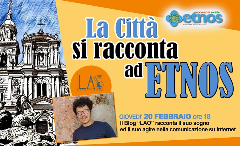 Terzo incontro domani, giovedì 20 Febbraio alle 18,30 di "La Città si racconta ad Etnos", il ciclo di appuntamenti per raccontare la città che nonostante tutto pensa e agisce in positivo, programmati da Febbraio sino a Giugno di quest’anno, alla Sala Polifunzionale del Centro Aggregativo del progetto Raggi d’Isole nella sede della cooperativa sociale Etnos in Via Aci n.18/b al Villaggio Unrra Casas. Protagonista di questo terzo incontro il blog LAO L’Antenna Online di Caltanissetta, rappresentato da uno dei fondatori Giulio Scarantino. Alla fine dell'incontro sarà offerta una degustazione da Equo Food ristorazione solidale.