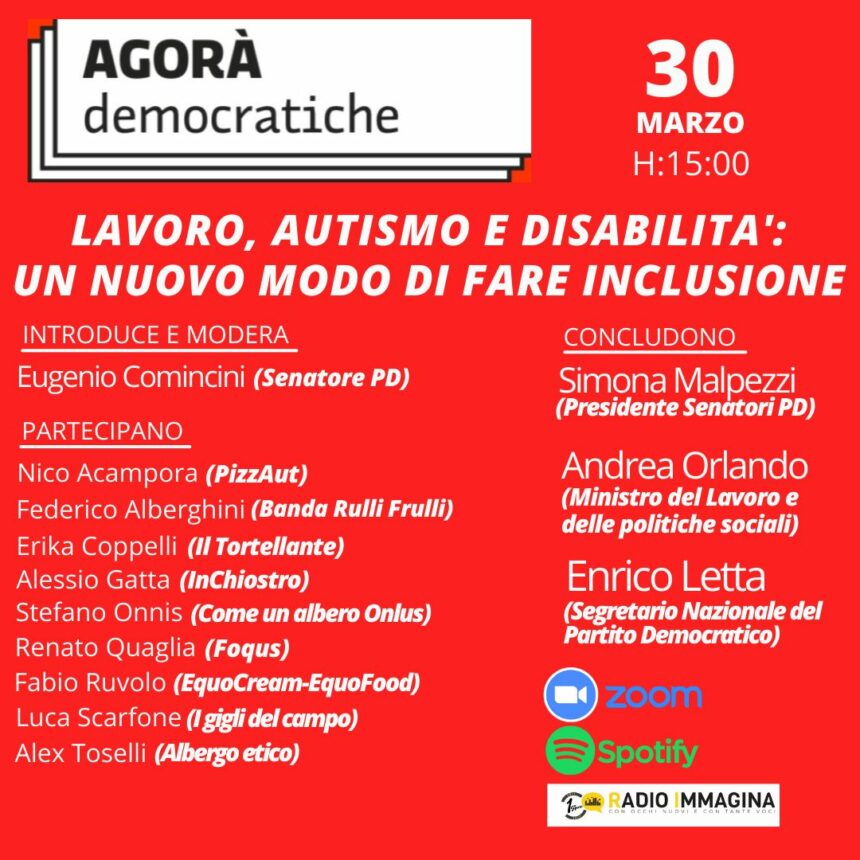 Presenzieranno anche altre realtà, come PizzAut, che da nord a sud operano affinché persone con disabilità e autismo possano inserirsi nel mondo del lavoro. A moderare l'incontro sarà Eugenio Comicini. Inoltre, vi sarà la partecipazione e di Enrico Letta, Segretario Nazionale del Partito Democratico, Simona Malpezzi, Presidente dei Senatori del PD, Andrea Orlando, Ministro del lavoro e delle pratiche sociali. Ancora oggi, per alcuni occhi le disabilità vengono viste come motivo di vergogna e per questo si tendono a nasconderle; oppure, è difficile scardinare quel pregiudizio che vuole la disabilità nell’ambito del lavoro come sinonimo di scarsa qualità, riassumibile nella frase “L’ha fatto lui (disabile), dunque non è di buona manifattura”. Non è così. Molte persone con disabilità hanno dimostrato con talento ed entusiasmo le proprie abilità professionali, grazie anche a corsi di formazione specializzati.