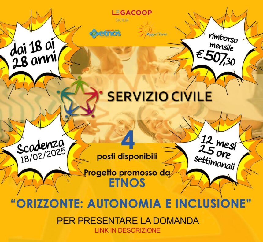 Vuoi prendere parte al Servizio civile? C'è ancora tempo fino al 18 febbraio per presentare la domanda. Nel 2025 la cooperativa sociale Etnos di Caltanissetta accoglierà all'interno della struttura “Raggi d'Isole” 4 volontari del Servizio civile universale. La presidenza del Consiglio ha infatti accolto il progetto di assistenza ai disabili “Orizzonte: autonomia e inclusione”. Il servizio civile è rivolto ai giovani tra i 18 e i 29 anni non ancora compiuti. Le domande potranno essere presentate fino alle ore 14 del 18 febbraio. Per consultare il bando e candidarsi bisogna accedere al seguente link https://www.legacoopsicilia.it/bando-servizio-civile-2024