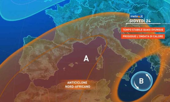 Le previsioni meteo per mercoledì 23. Tempo prevalentemente soleggiato, stabile e molto caldo. Nel pomeriggio sviluppo di nubi cumuliformi attorno alle zone montuose, con la possibilità di isolati e brevi temporali di calore nelle Alpi, sull’Appennino calabrese e nelle zone interne della Sicilia. Temperature senza grandi variazioni: massime fino a 38-39°C sulla bassa val padana tra Lombardia ed Emilia, nelle zone interne e tirreniche peninsulari e in Sardegna. Minime all’alba in molti casi non inferiori a 24-25 gradi. Clima afoso soprattutto al Nord. Venti: a prevalente regime di brezza. Mari calmi o poco mossi.