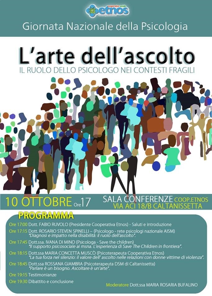 Domani, mercoledì 10 ottobre alle 17:00 si svolgerà a Caltanissetta, presso la sala conferenze della Cooperativa Sociale Etnos in via Aci 18, il convegno: "L'arte dell'ascolto – Il ruolo dello psicologo nei contesti fragili".