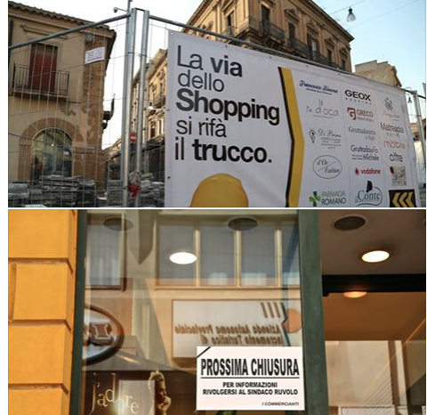 Si apre un fronte tra i negozianti del centro storico di Caltanissetta, tutti coinvolti nell'operazione di maquillage del corso Vittorio Emanuele. Stamattina, su iniziativa di alcuni commercianti, sono apparsi sulle vetrine degli adesivi listati a lutto in cui diversi esercenti annunciano la “prossima chiusura” addebitando responsabilità al sindaco Giovanni Ruvolo. Parallelamente, altri commercianti hanno avviato una operazione di comunicazione più positiva, esponendo i loghi dei propri negozi su un telone agganciato alla cancellata del cantiere ricordando ai passanti che “La via dello shopping si rifà il trucco”.