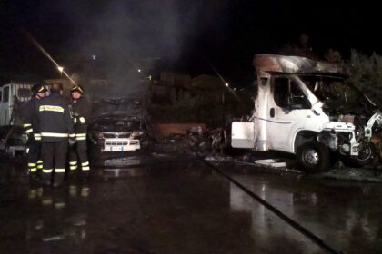 Incendio in officina di via Xiboli: distrutti camper, auto e furgoni LE FOTO