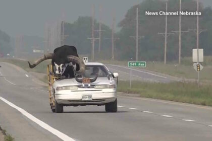 Toro gigante come passeggero sul sedile anteriore, fermato autista in Nebraska
