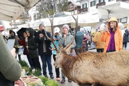 Cervo affamato va al mercato della frutta a Cortina e viene rifocillato dai venditori