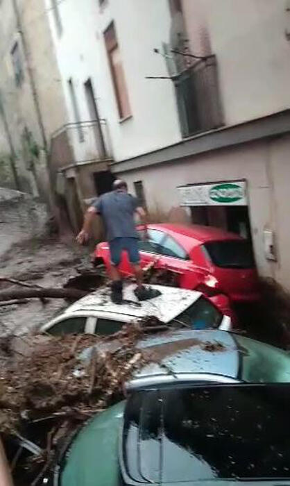 Nel centro storico, la stessa zona duramente colpita l'anno scorso da un'alluvione, sono state evacuate cinque persone che si erano poste in salvo nei piani alti delle abitazioni dopo il totale allagamento dei vani terranei. Al momento non si segnalano feriti, ma la conta dei danni è destinata a diventare consistente. Colate di acqua e fango hanno invaso il centro storico del Comune in seguito alle forti precipitazioni cominciate nel primo pomeriggio. La situazione permane critica soprattutto in piazza Aldo Moro, dove ha sede il municipio, già duramente colpita due anni fa, dall'alluvione del settembre 2020.