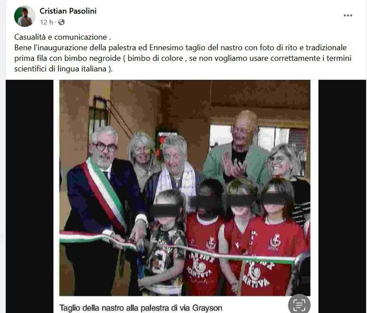 (Adnkronos) – Polemiche sul segretario della Lega di Mantova, Cristian Pasolini, che su Facebook ha usato l'espressione “bimbo negroide”, condividendo la foto dell'inaugurazione di una palestra con il sindaco Pd Mattia Palazzi. “Casualità e comunicazione. Bene l'inaugurazione della palestra ed ennesimo taglio del nastro con foto di rito e tradizionale prima fila con bambino negroide (bimbo di colore, se non vogliamo usare correttamente i termini scientifici di lingua italiana)”, scrive Pasolini a corredo dell'immagine.