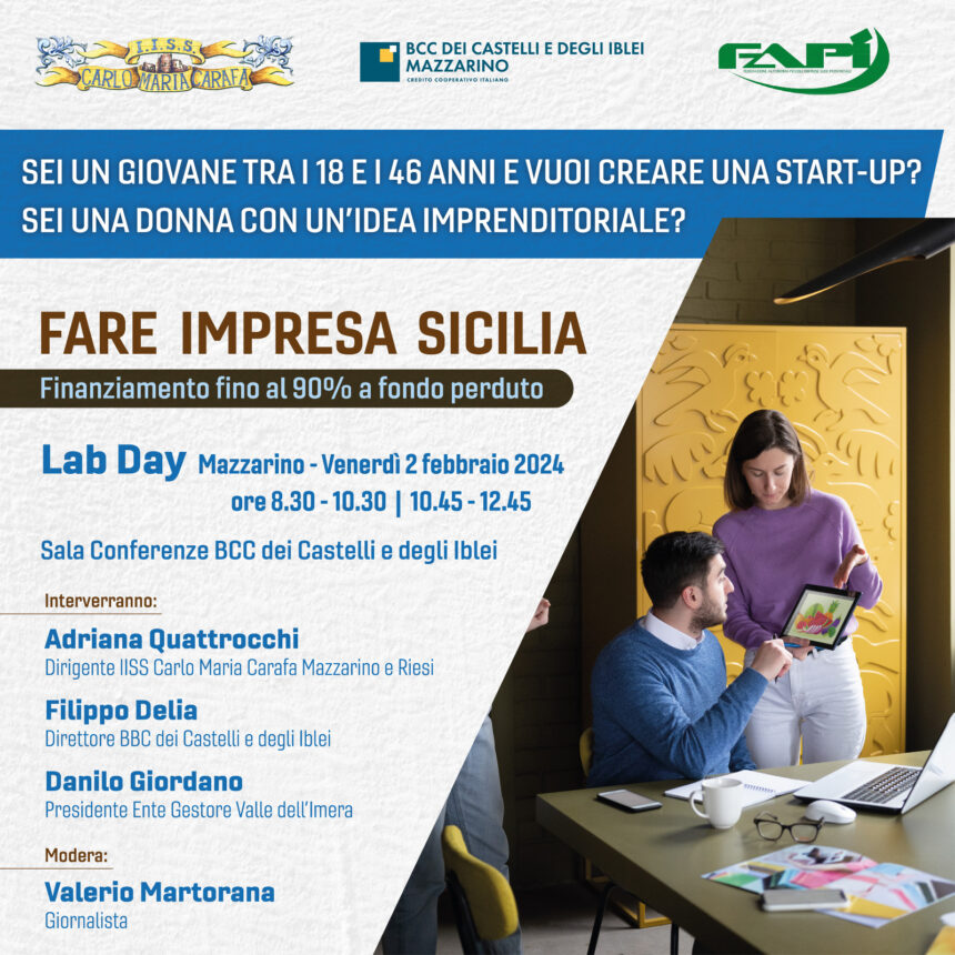 Nel corso del Lab Day, che si svolgerà in due sessioni dalle 8.30 alle 10.30 e dalle ore 10.45 alle ore 12.45, interverranno: Adriana Quattrocchi, dirigente dell’Iss Carafa di Riesi e Mazzarino; Filippo Delia, direttore generale della BCC dei Castelli e degli Iblei e Danilo Giordano, Presidente Ente gestore Valle dell’Imera. L’incontro sarà moderato dal giornalista Valerio Martorana.