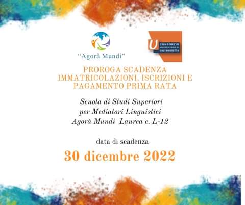 Proroga scadenza immatricolazioni, iscrizioni e pagamento prima rata sede Caltanissetta. A seguito delle numerose richieste di informazioni e del sovraccarico della segreteria nell'espletare tutte le richieste a noi pervenute, si comunica la proroga scadenza immatricolazioni, iscrizioni e pagamento prima rata al 30 Dicembre 2022. Nei giorni 3 e 4 gennaio 2023 presso la sede del Consorzio Universitario di Caltanissetta, Corso V. Emanuele, 92 , dalle ore 08,00 alle ore 14,00, la tutor del Corso, Dott.ssa Marta Failla sarà a disposizione per info e immatricolazioni.