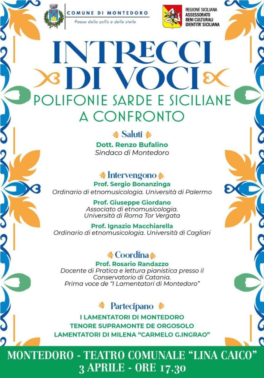 Il Teatro Comunale “Lina Caico” di Montedoro si appresta ad accogliere, il prossimo 3 aprile alle ore 17:30, l'evento “Intrecci di Voci: Polifonie Sarde e Siciliane a Confronto”, un'imperdibile occasione di incontro e approfondimento sulle tradizioni musicali polifoniche delle due isole.