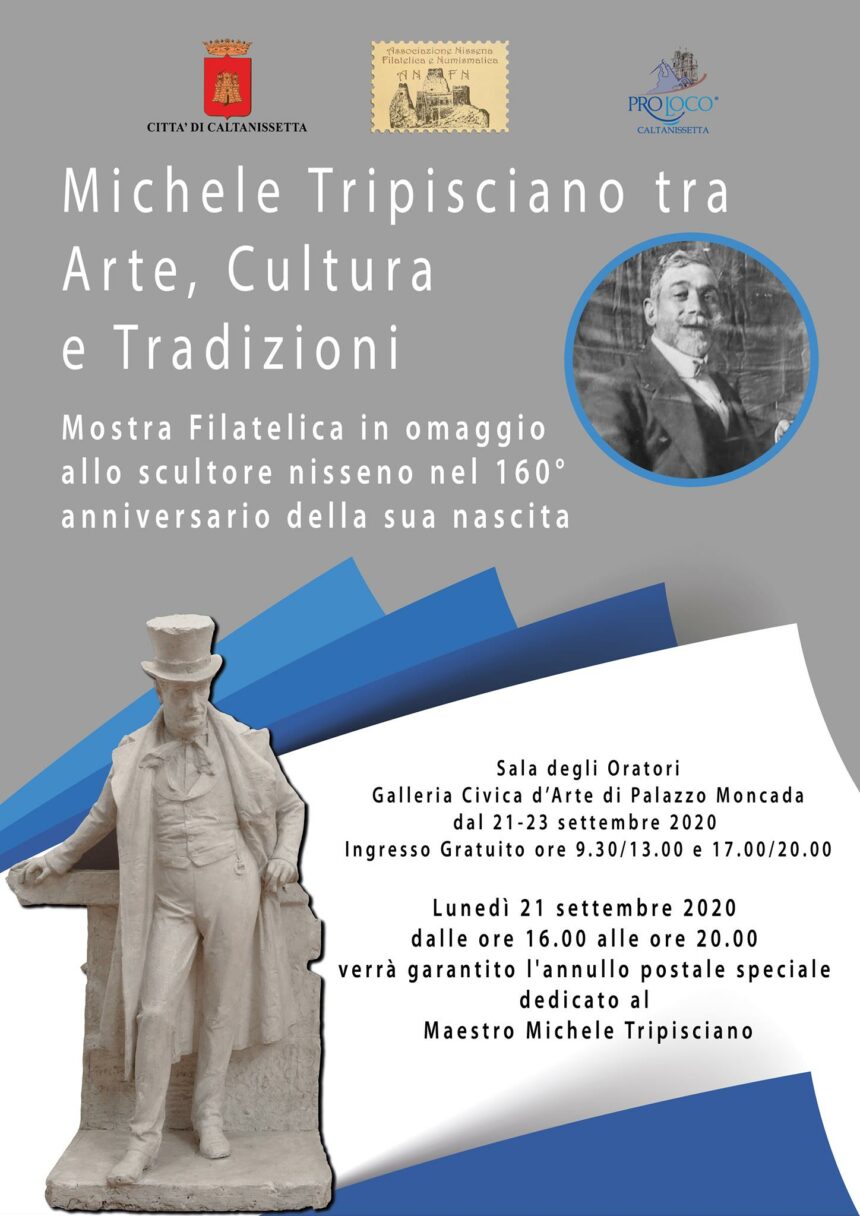 L’Associazione Nissena Filatelica e Numismatica, la Pro Loco di Caltanissetta e il Comune presentano la mostra filatelica in omaggio allo scultore nisseno Michele Tripisciano nel 160° anniversario della sua nascita presso la Galleria Civica d’Arte di Palazzo Moncada dal 21 al 23 settembre 2020. L’inaugurazione avverrà lunedì 21 alle ore 16.30 e per l’occasione Poste Italiane Spa garantirà un annullo postale speciale dedicato allo scultore. Michele Tripisciano nacque a Caltanissetta il 13 Luglio 1860. Grazie al barone Lanzirotti, suo mecenate, andò a studiare a Roma presso l’Ospizio San Michele a Ripa ed in seguito presso lo studio di Francesco Fabi Altini, da cui apprese a modellare figure morbide e flessuose. Sono numerose le sculture del Tripisciano nella capitale, per esempio la Sicilia sull’Altare della Patria, gli Angeli della Basilica di Sant’Andrea della Valle, Paolo e Ortensio presso la Cassazione, il monumento a Gioacchino Belli nell’omonima piazza. Lo scultore morì a Caltanissetta il 21 settembre 1913, donando alla sua città il preziosissimo patrimonio di sculture e bozzetti presenti nel suo studio di Roma, conservati all’interno di Palazzo Moncada. L’ingresso all’interno di Palazzo Moncada sarà garantito nel rispetto della normativa anticovid (ingresso contingentato, mascherina e uso di gel igienizzante). La mostra sarà visitabile nei giorni martedì 22 e mercoledì 23 dalle ore 09.30 alle ore 13.00 (ultimo ingresso ore 12.30) e dalle ore 17.00 alle ore 20.00 (ultimo ingresso ore 19.30).