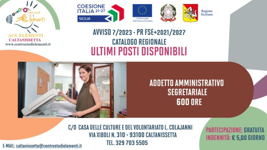 Il Movi di Caltanissetta comunica che sono ancora aperte le iscrizioni per il corso di Addetto amministrativo segretariale di 600 ore. Sono disponibili gli ultimi posti. L'iscrizione si chiuderà alle ore 12 dell'8 febbraio. I corsi sono rivolti a tutte le persone disoccupate dai 18 ai 60 anni. Per informazioni contattare il numero 329.7035505. La partecipazione al corso è gratuita. È prevista un'indennità di 5 euro al giorno.