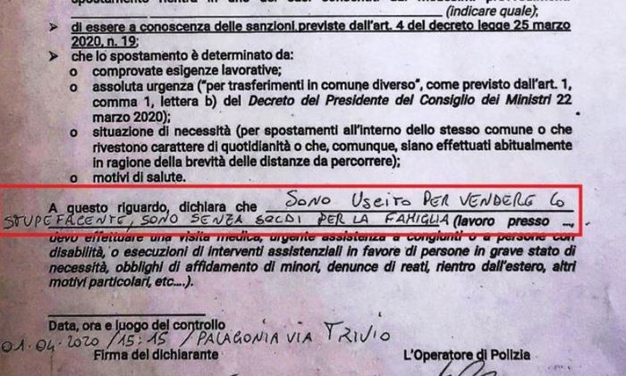 "Sono uscito per vendere lo stupefacente, sono senza soldi per la famiglia": così ha scritto sull'autocertificazione per l'emergenza Covid-19 per motivare l'uscita di casa un pusher di 46 anni. La 'giustificazione' è stata messa nero su bianco del documento consegnato ai carabinieri di Palagonia che lo avevano bloccato mentre vendeva droga a due 'clienti'. L'uomo, trovato in possesso di 20 dosi di marijuana e sei grammi di cocaina, è stati posto agli arresti domiciliari. (ANSA)