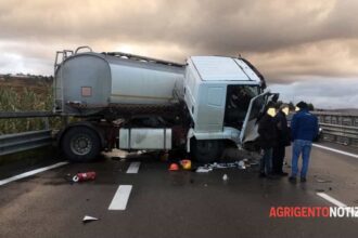 Sulla Caltanissetta-Agrigento autocisterna sbanda e un'auto le finisce contro: 3 feriti